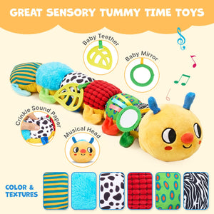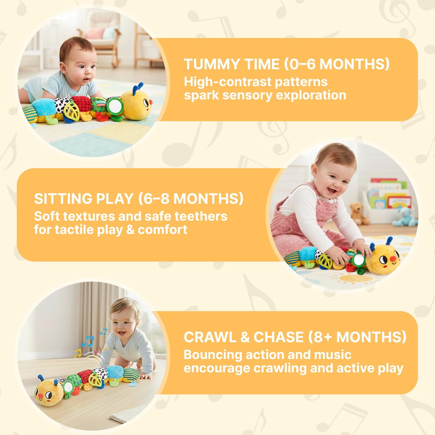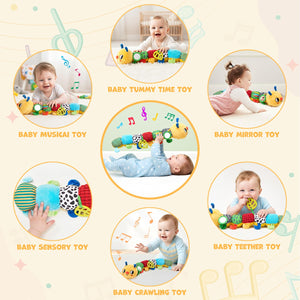 • [5-in-1 Caterpillar Toy] JoyCat Musical Crawling Caterpillar Plush Toy is a 5-in-1 baby companion, combining music, sensory play, soothing comfort, crawling fun, and cuddly plush. Its soft, skin-friendly head houses a motion-sensing music module—turn it on, gently tap, and watch the caterpillar bounce and wiggle with cheerful music, creating a fun, interactive experience for your little one. A perfect everyday playtime friend that grows with your baby, bringing smiles, giggles, and joyful play at home or on the go!