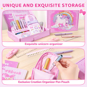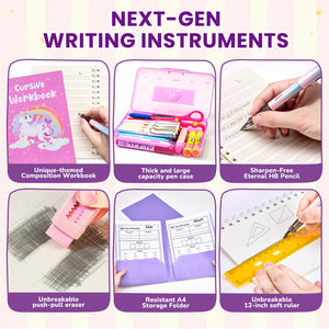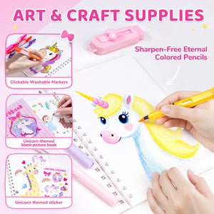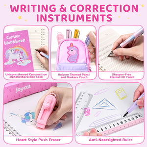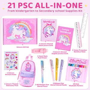 • 【WHAT'S INCLUDED】 10-color washable Click markers,1 push-pull eraser, 1 English workbook focused on unicorn cover design, 1 drawing book for unicorn cover design, 1 original unicorn sticker set with 15 different shapes, 2anti-myopia rulers (15cm and 6 inches), 1 handheld pen case featuring an original unicorn design, 3 non-sharpening permanent colored pencils, 1 no-sharpening HB eternal pencil. This set provides all the necessary items for entry into the lower grades.