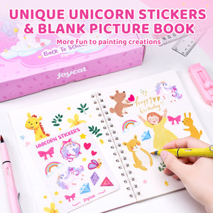 • 【IMAGINATIVE NOTE&PICTURE BOOK,STICKERS FEATURING】 Foster your child's imagination with unicorn-themed English and drawing notebooks that cater to both educational and artistic pursuits, along with adorable books that can help your child stand out among peers. The notebooks feature a 360-degree folding, double helix design for easy single-handed use and quick access to various content. Additionally, there are 15 unique unicorn-themed stickers that enhance children's artistic projects while inspiring their creativity and enthusiasm for writing.So Also ideal for journaling and Stationery sets