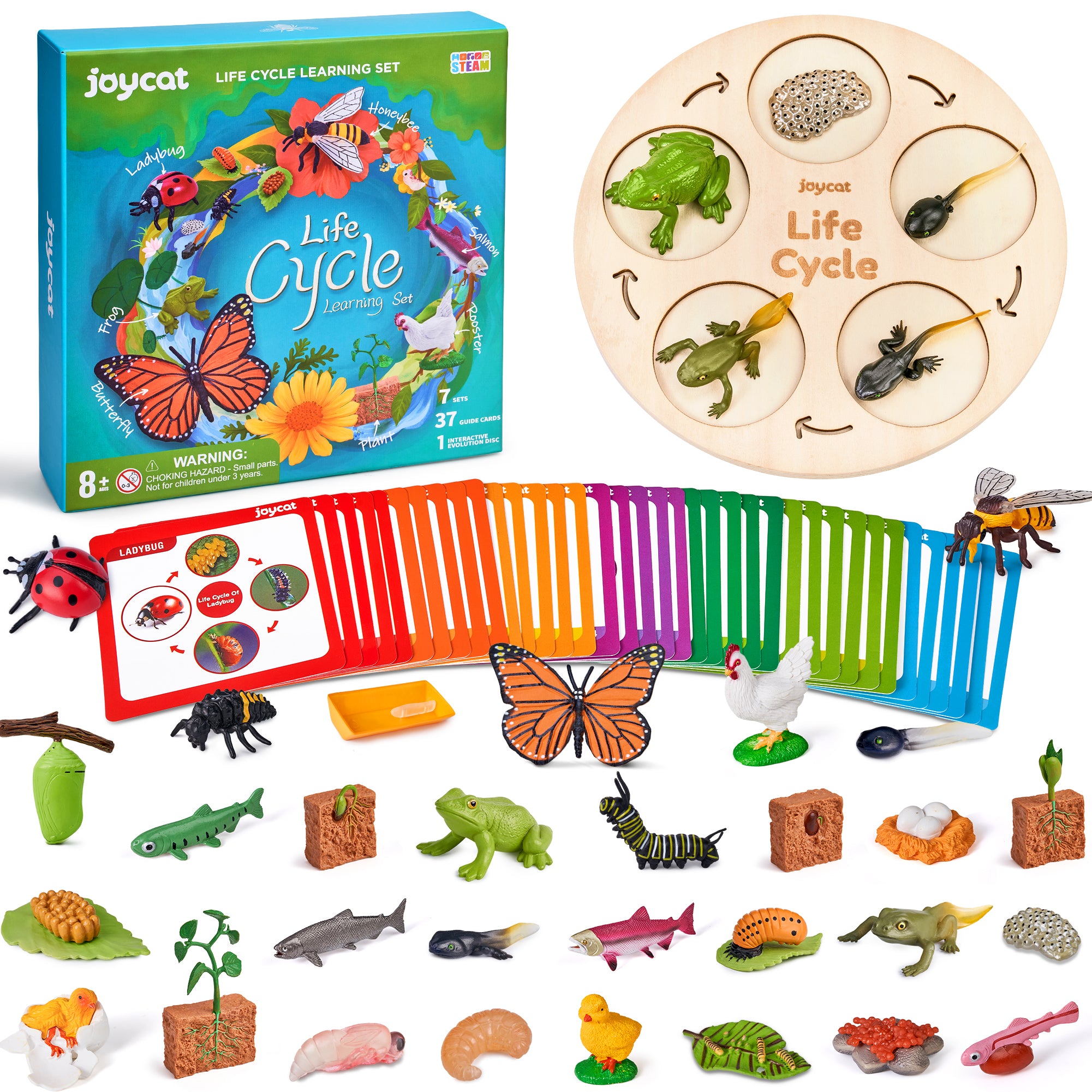 - Life Cycle Leaning Toys: Contains 4 Sets of Plastic Realistic Insect Animals Including Butterfly, Frog, Ladybug, and Bee. With 21pcs of insect introducing cards and 1pcs Double-Side of life cycle presenting wooden board. Good visual representation for preshcooler.