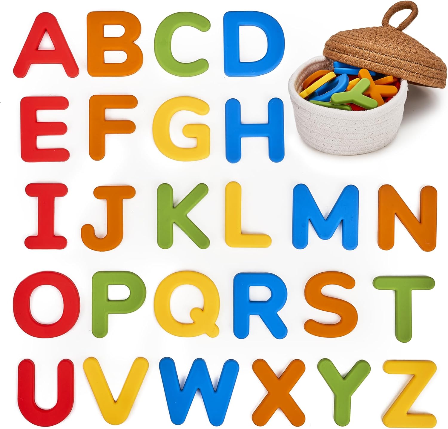 • What's in it: This silicone alphabet set includes 26 chunky letters (A-Z) in 5 muted tones, packaged in a reusable cotton-linen box. Each silicone letter with embedded magnets adheres reliably to fridges or whiteboards. Sized for small hands to explore letter shapes
