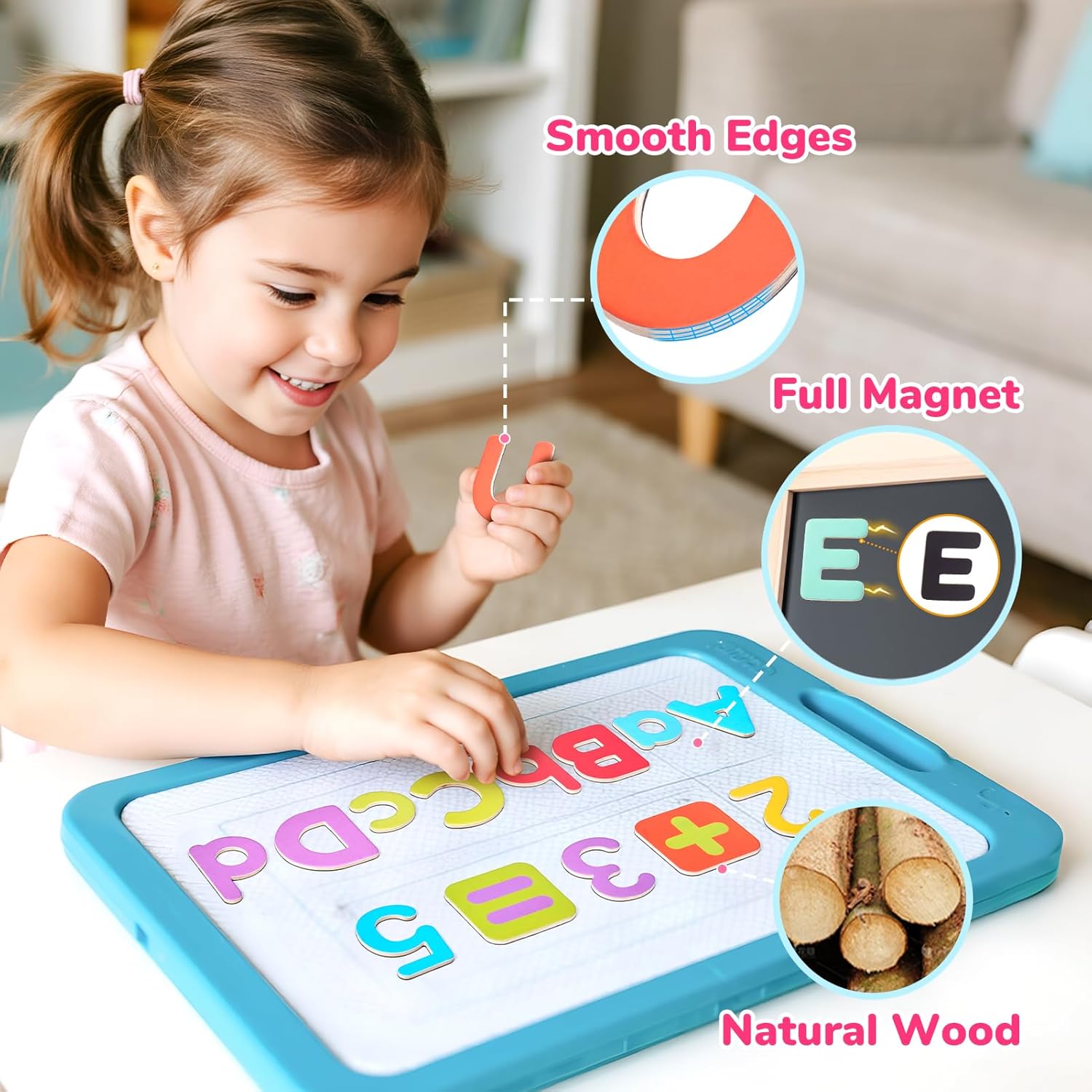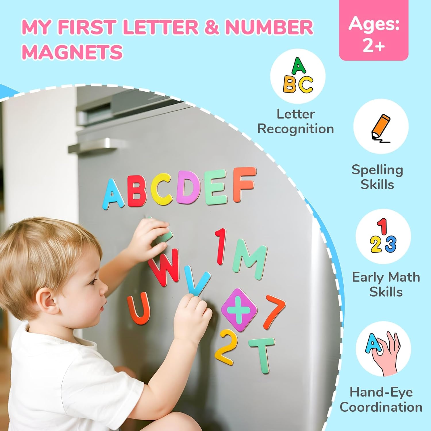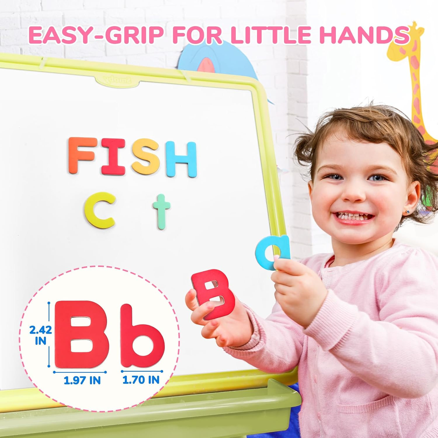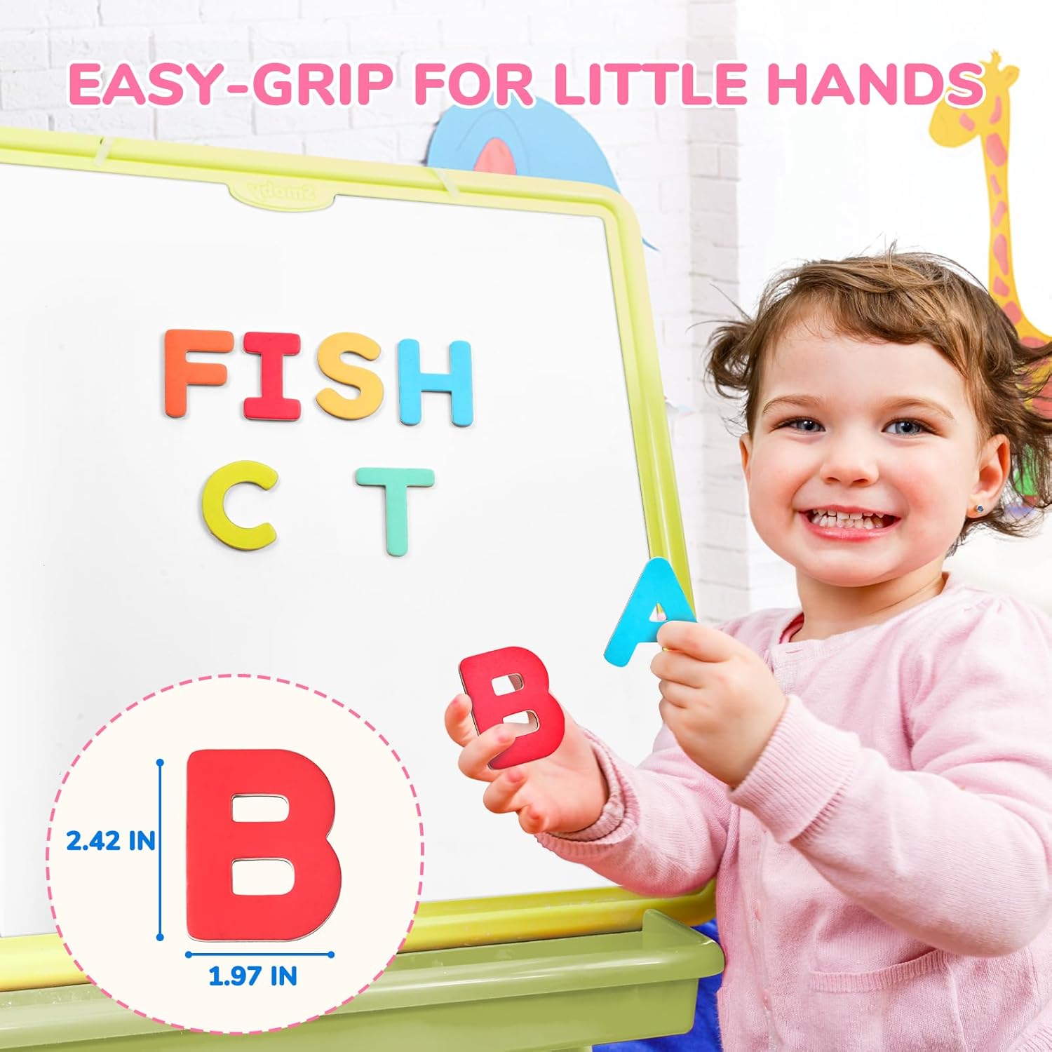 - Design for Kids: Specifically sized for small fingers! Each uppercase letter measures approximately 2.44" x 2.44". Features full-back magnetic coverage for secure attachment during play. Smooth, rounded edges ensure comfortable handling while supporting letter/number recognition