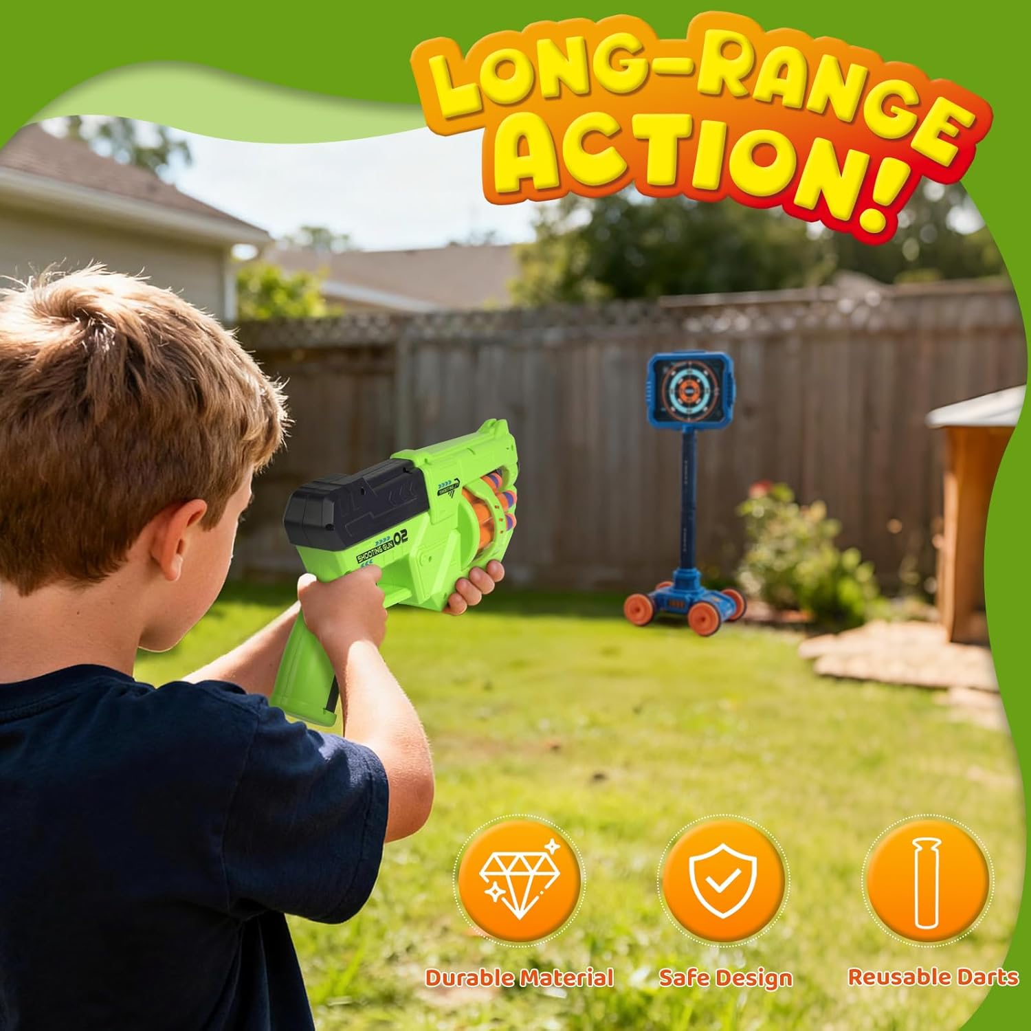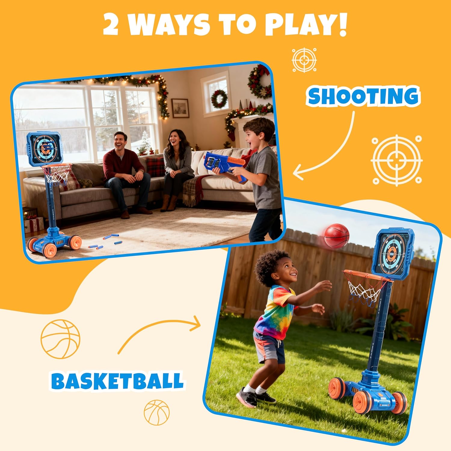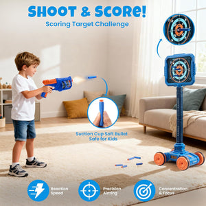 - 【2-IN-1 DYNAMIC FUN】SHOOTING GAME & BASKETBALL ALL IN ONE!This boy toy basketball & foam blaster gun set with target and a basketball hoop. Kids can enjoy two exciting games in one set, switching between sharpshooter training and basketball practice, which doubles the play value and keeps them engaged for hours