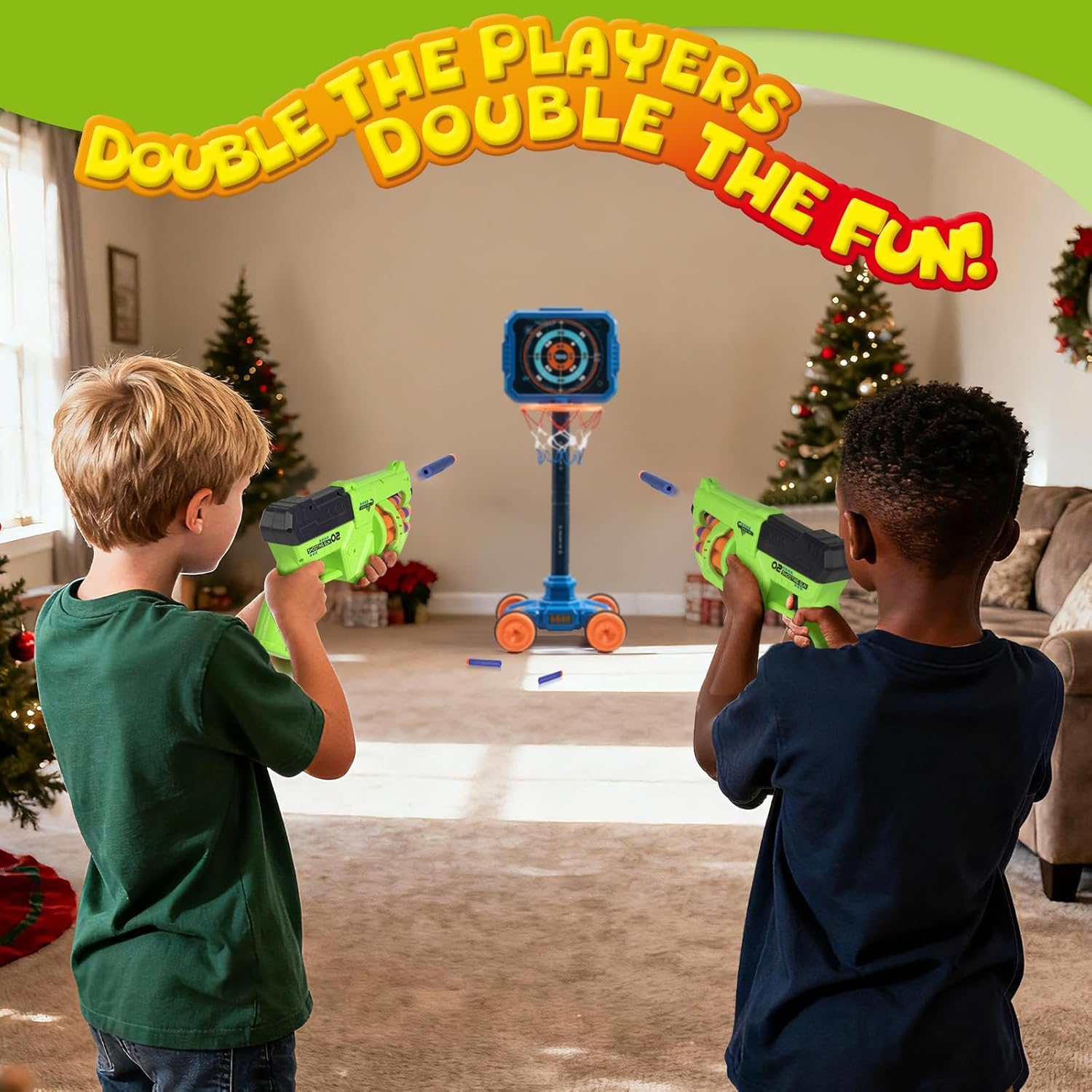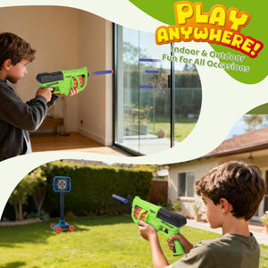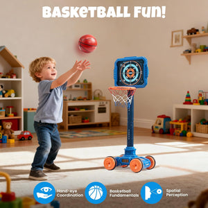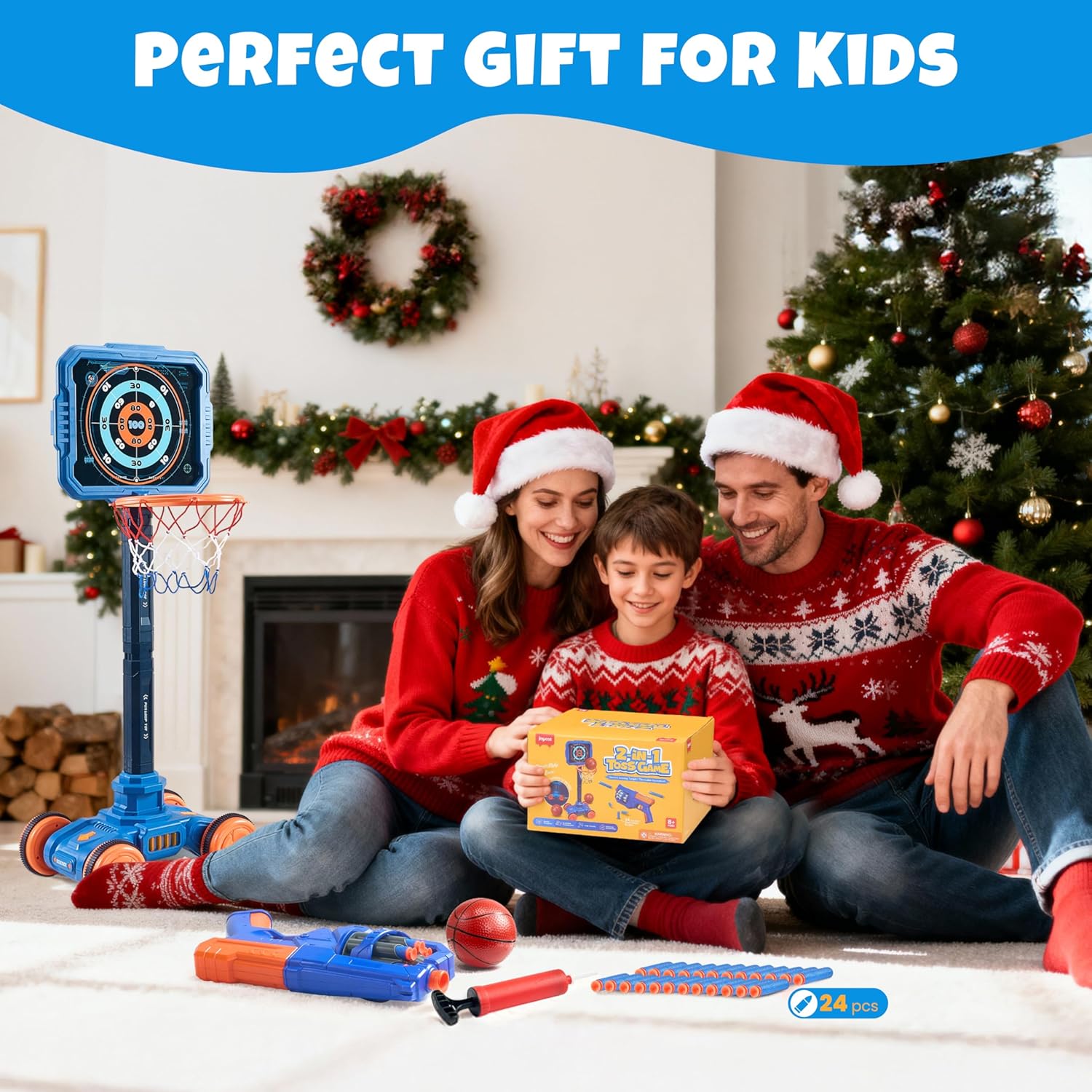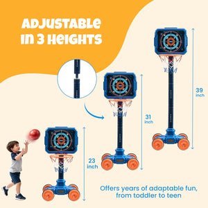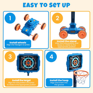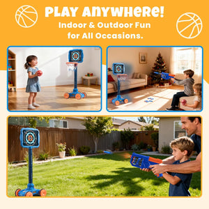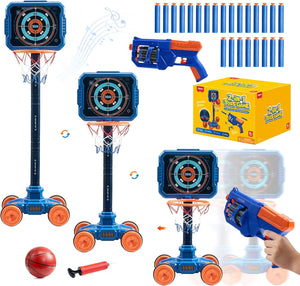 - 【SAFE & COMPLETE PACKAGE】READY FOR INDOOR/OUTDOOR ADVENTURE!Crafted with child-safe materials and soft foam darts for worry-free play. The set comes fully loaded with 1 basektball hoop, 1 target, 1 dart blaster, 24 soft darts, 1 basketball and 1 air pump—everything needed for immediate fun right out of the box, anywhere