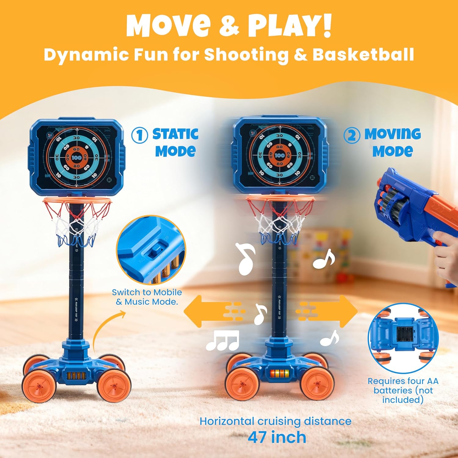 - 【AUTO-CRUISE & MUSIC MODE】MOVING TARGET MAKES PLAY MORE THRILLING!Switch to cruise mode and watch the hoop automatically slide side-to-side across a 1.2m range! With fun background music, it creates a dynamic, arcade-like challenge that dramatically boosts kids' hand-eye coordination, reflexes, and tracking skills