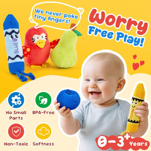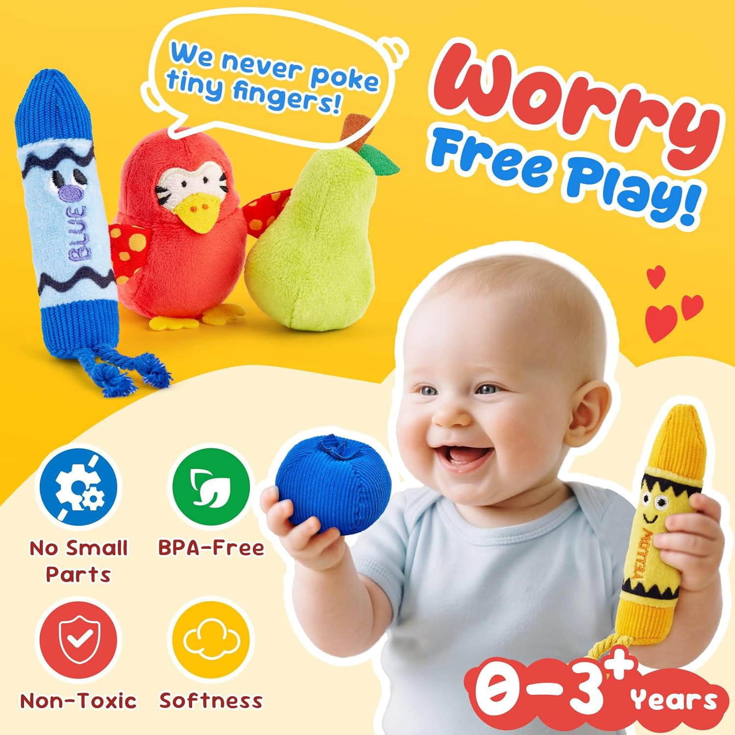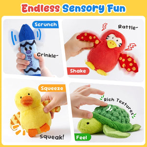 - Fun Sensory Shapes & Textures: Spark joy with crinkly crayons, squeaky fruits, and textured animal toys—perfect as sensory toys for babies! Each piece features unique sounds and shapes to engage your toddler’s senses while promoting fine motor development through hands-on play