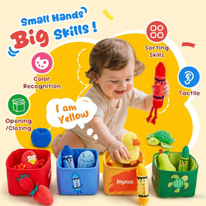 - Montessori Color Learning: These Montessori toys for 1 year old include four vibrant color sorting toys designed to teach color recognition naturally. Your little one will learn to match each toy to its matching box—building essential cognitive skills through screen-free, open-ended exploration