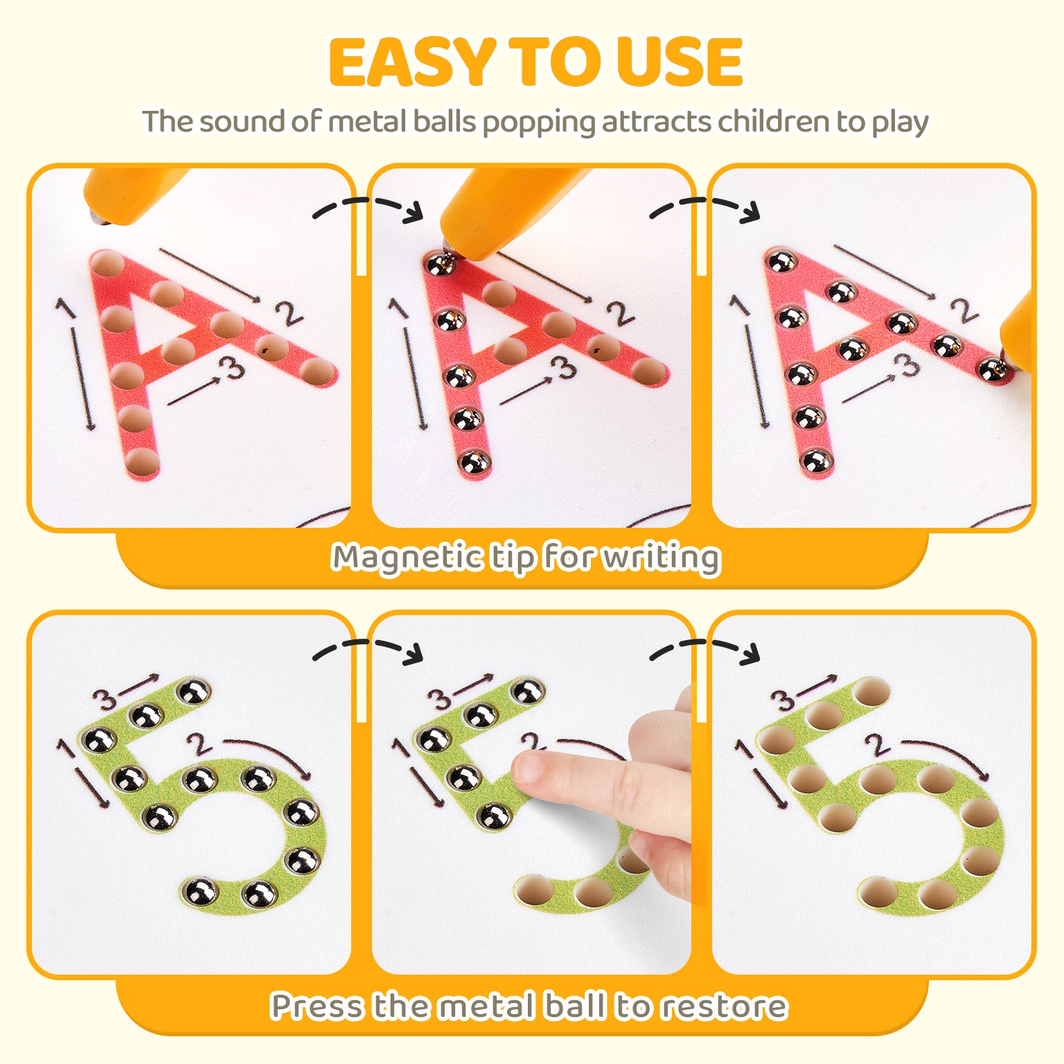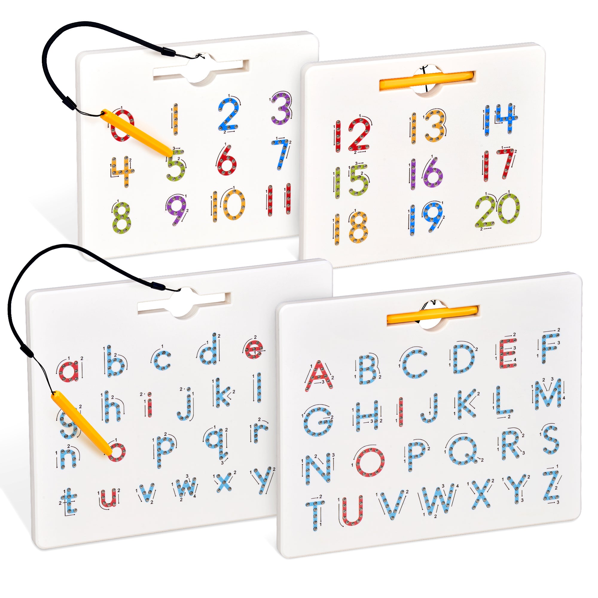 - Great Tool to Teach Writing: Children using the stylus pen help them stay on the stroke - and they love to hear and see the metal beads pop up as they go. Then they can use their finger to erase each letter. With the sequence stroke and path direction instruction guide next to each alphabet character