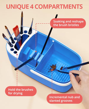 - 【3 Compartments for Washing】One side has incremental nubs and slanted grooves along the bottom for brush cleaning. The other side has two compartments with a brush rest for soaking and reshaping the brush bristles.
