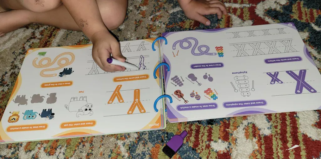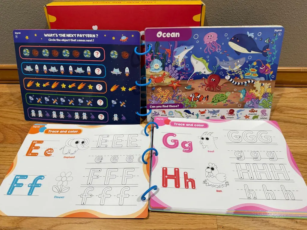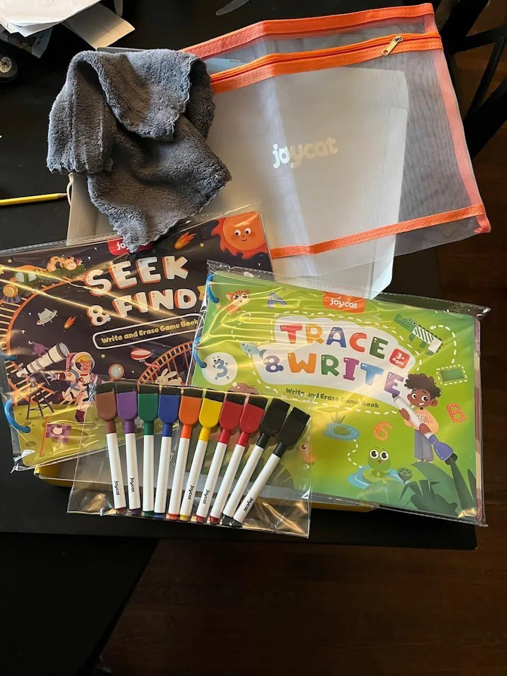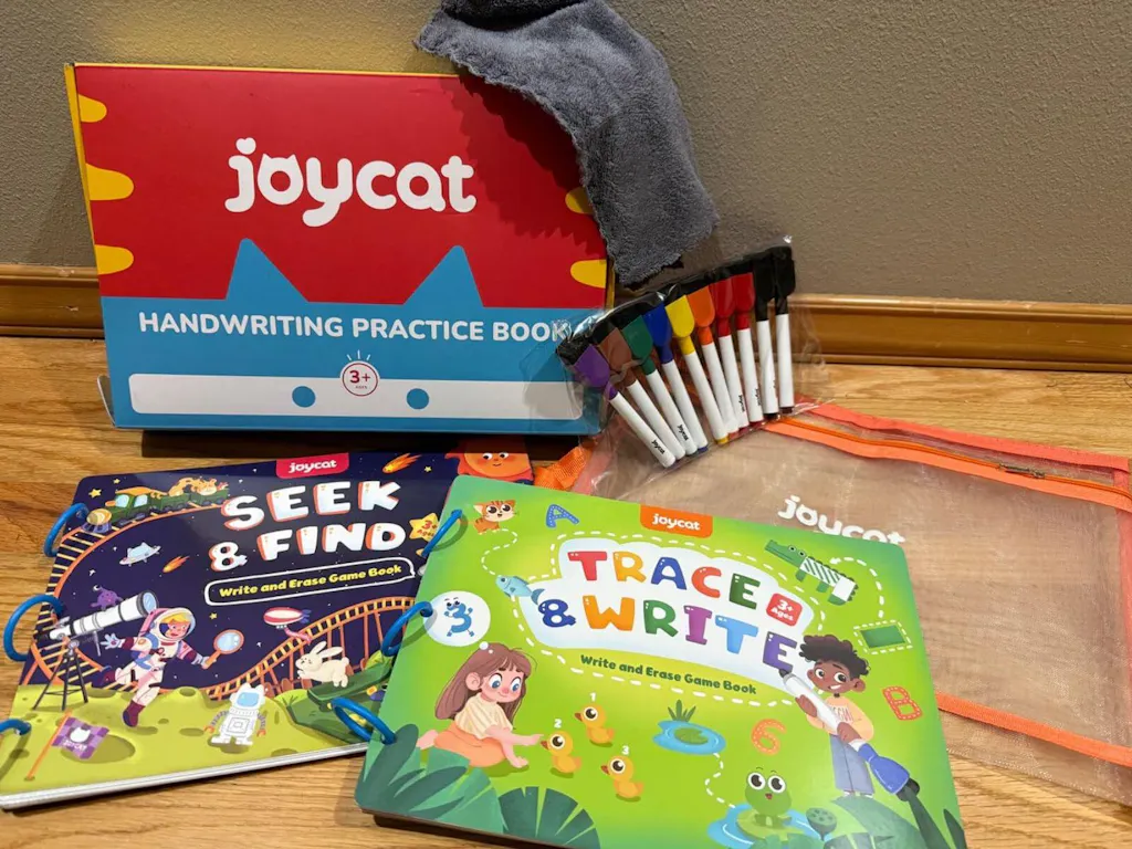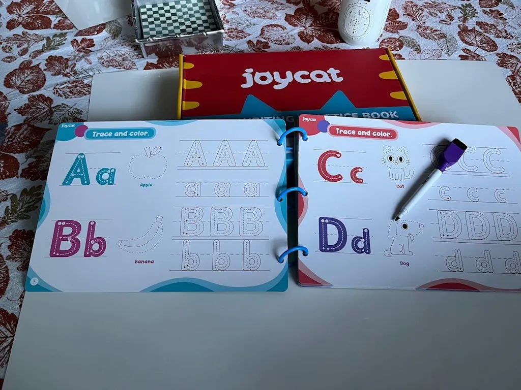 Reusable handwriting practice book with 48 pages of letters, numbers, mazes, and shapes. Includes 10 dry-erase markers, storage bag, and cloth for mess-free learning. Waterproof cardboard pages support tracing, writing, and hand-eye coordination development. Perfect for ages 3–6 at home, school, or on the go. Comes beautifully gift-boxed.